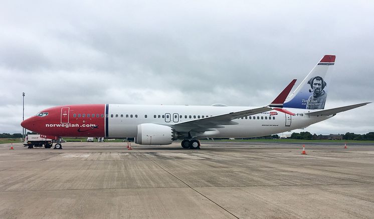 Norwegian's 737MAX aircraft with Tom Crean tail fin at Belfast International Airport