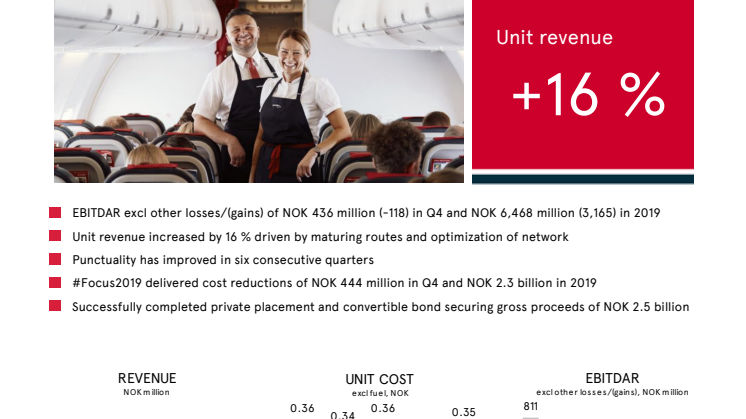 Norwegian today reported its full year and fourth quarter 2019 results. Year on year, unit revenue increased in nine consecutive months, driven by maturing routes and the optimization of Norwegian's global route network. The punctuality has improved considerably during the past six quarters, and in the fourth quarter 2019 it was up 3.1 percentage points to 82.6 percent.
