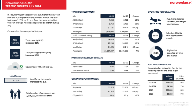 Norwegian’s capacity (ASK) was 4,068 million seat kilometres, up 10 percent from the same period last year. Actual passenger traffic (RPK) was 3,763 million seat kilometres, an increase of 10 percent from July 2023. Load factor increased by 0.1 percentage point from July 2023 to 92.5 percent, an increase of more than 8 percentage points from the previous month. In July, Norwegian operated with a regularity, meaning share of scheduled flights taking place, of 99.5 percent. The punctuality, meaning share of flights departing within 15 minutes of scheduled time, was 67.6 percent, down 5.6 percentage points from July last year. However, 93 percent of all flights arrived within 60 minutes of scheduled arrival time. During July, European air space was heavily congested with several air traffic control (ATC) restrictions. This resulted in a lower than usual punctuality across European airlines. The airline operated an average of 87 aircraft in July.