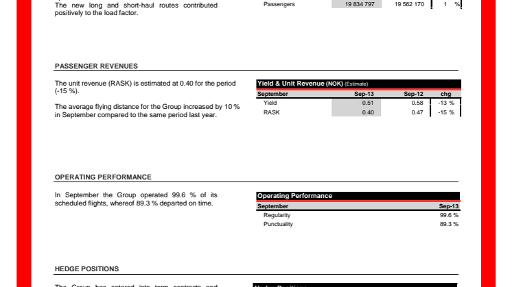 The airline carried 1,920,329 passengers in September, an increase of 272,627 passengers (17 percent) compared to September 2012. The total capacity (ASK) increased by 33 percent and the passenger traffic (RPK) increased by 30 percent. The load factor was 78.3 percent, down 1.7 percentage point from the same month last year.