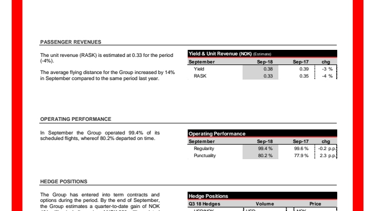 Norwegian operated 99.4 percent of the scheduled flights in September, whereof 80.2 percent departed on time, up 2.3 percentage points compared to the same month last year.