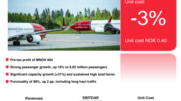 “In this quarter, we clearly see the outline of the company’s growth strategy. We have a strong passenger growth in all markets and we have managed to maintain a high load factor. At the same time, our results this quarter are significantly affected by the additional costs associated with replacement aircraft for the Dreamliner. In addition, Northern European sun seekers chose to enjoy the warm summer at home instead of flying south,” said CEO Bjørn Kjos.