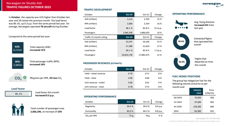 Norwegian had 2,066,296 passengers in October, up 10 percent from October 2022. The capacity (ASK) was 3,115 million seat kilometres, while actual passenger traffic (RPK) was 2,683 million seat kilometres. In October, Norwegian operated an average of 78 aircraft with a regularity, share of scheduled flights taking place, of 99.4 percent. Punctuality, the share of flights departing within 15 minutes of scheduled time, was at 85.0 percent in October. However, a total of 98 percent of all departed flights arrived on schedule or within one hour of scheduled arrival time.