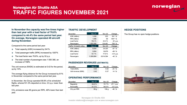 Norwegian's traffic figures for November show that for a second consecutive month over one million passengers travelled with Norwegian. Adjustments to our capacity and route network for the winter season have been well adapted to customer demand.